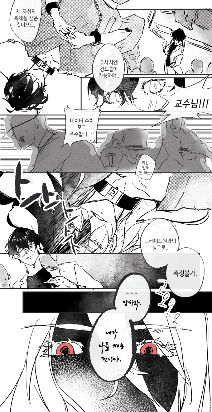 여튼...하..습....황구가 그린 김세경도 김세경이지만 카시우스..최고다..외형 바뀌는 거 진짜 너무..최고..최고고요....신성한 느낌마저 듭니다..심지어 제일 좋은 건 싱크로 측정불가라는 말임 아!!!!!! 황구가 오타쿠 환장하게 하네 어?!?!? 싱크로가 높다못해 수치를 드러내는게 의미없을 정도라는 걸 말해주고 있는 거 같아서 너무 좋다고요 흐흑 ㅅㅂ사람살려!!! 원래는 저 복제품의 육체가 못 버텨야하는데, 카시우스가 넘 압도적인 존재라서 그마저 가능하게 했다는 느낌인것두 좋음ㅠㅋㅋㅋ 하.....ㅅㅂ눈감고 있는 것도 인외느낌으로 성스럽고..신비하고 좋았는데 아 눈뜨고 말하는 거 미치겠네 ㅅㅂ심지어 부른 것도 아냐 깨웠대 진짜 오랫동안 잠들어서 인간들의 입에서도 잘 전해지지 않았지만 압도적인 존재를 불러온 기분이라서 너무 짜릿하다 그야말로 근본이라고 해야할 정도로...그정도로 존재감 느껴지는거 넘 조와요....하 황구가 이 다음 안 그려주려나...아니 진짜 어쩌자구 일케 잘 그리는거냐..걍 이 만화 하나로 여러가지 자꾸 생각하게됨 황구가 천재라는 뜻이겠죠ㅠ....연출도 너무 좋고요....하...사실 초커해놓은 것도 너무 좋음 아 미치겟네 정말...흐흑..이런 만화를 그려주는 황구 정말..감사하다....