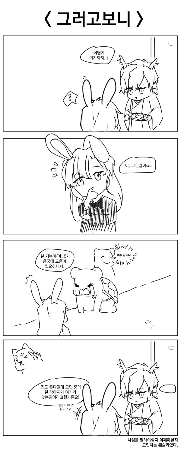 아 황멍 진자 기만이 장난아니다 못그린다 어쩐다하더니 아 ㅅㅄㅂ 졸라 기엽구 내용도 너무 귀여움 악 문 열고 나오는 웨슬리 보고 첨에 음 용인가? 했는데 아직 이무기인거 어딘가 애기같고 기엽다 히 히히히 아니 게다가 이나 접시에 생선 있는거 앗쉬 너무 기엽다고 아 깨알같은 요소마저 미쳐버린 황멍....흑흐흑 이나가 주는거 일단 받는 웨슬리두 너무 조아 흐흑 이무기니까 웨무기(아무말 웨슬리 용 되려고 이것저것 수행하거나 하려나 헤헤 구경하구싶다 하아 뭔가 애들 바다 속 동숲 같은 느낌이라 너무 조아 ㅠㅠ